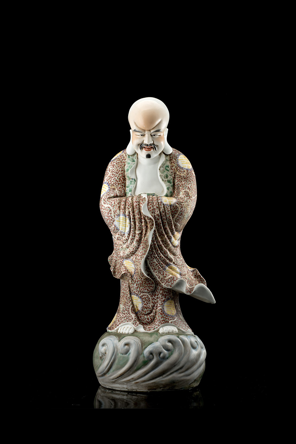 A polychrome porcelain model of a monk wearing ornate robes and standing on a clous-shaped base