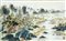 Placca in porcellana dalla forma rettangolare, dipinta in policromia con paesaggio montano, fiume e pescatori su barche, calligrafia e sigillo dell'artista Wang Yeting