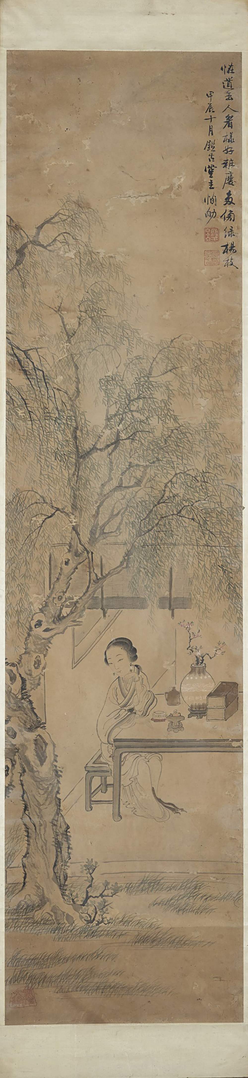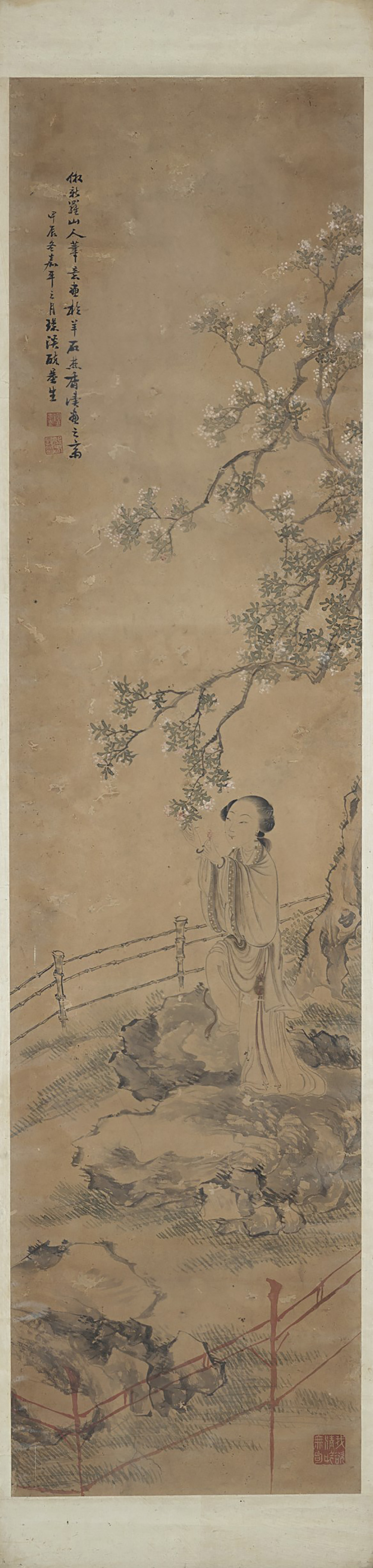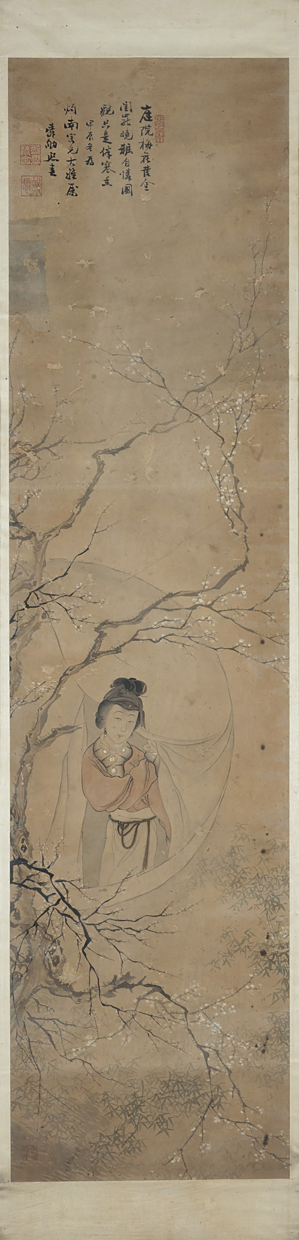 Quattro pannelli raffiguranti dame in giardini e padiglioni con iscrizioni calligrafiche, inchiostro e colore su carta, con cornice