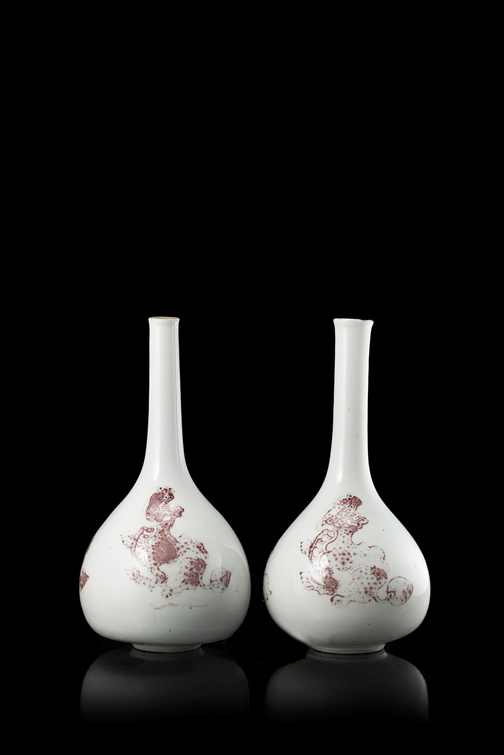 Coppia di vasi a bottiglia decorati in rosso rame con creature fantastiche (pixiu e bixie), gli occhi in smalto blu