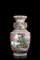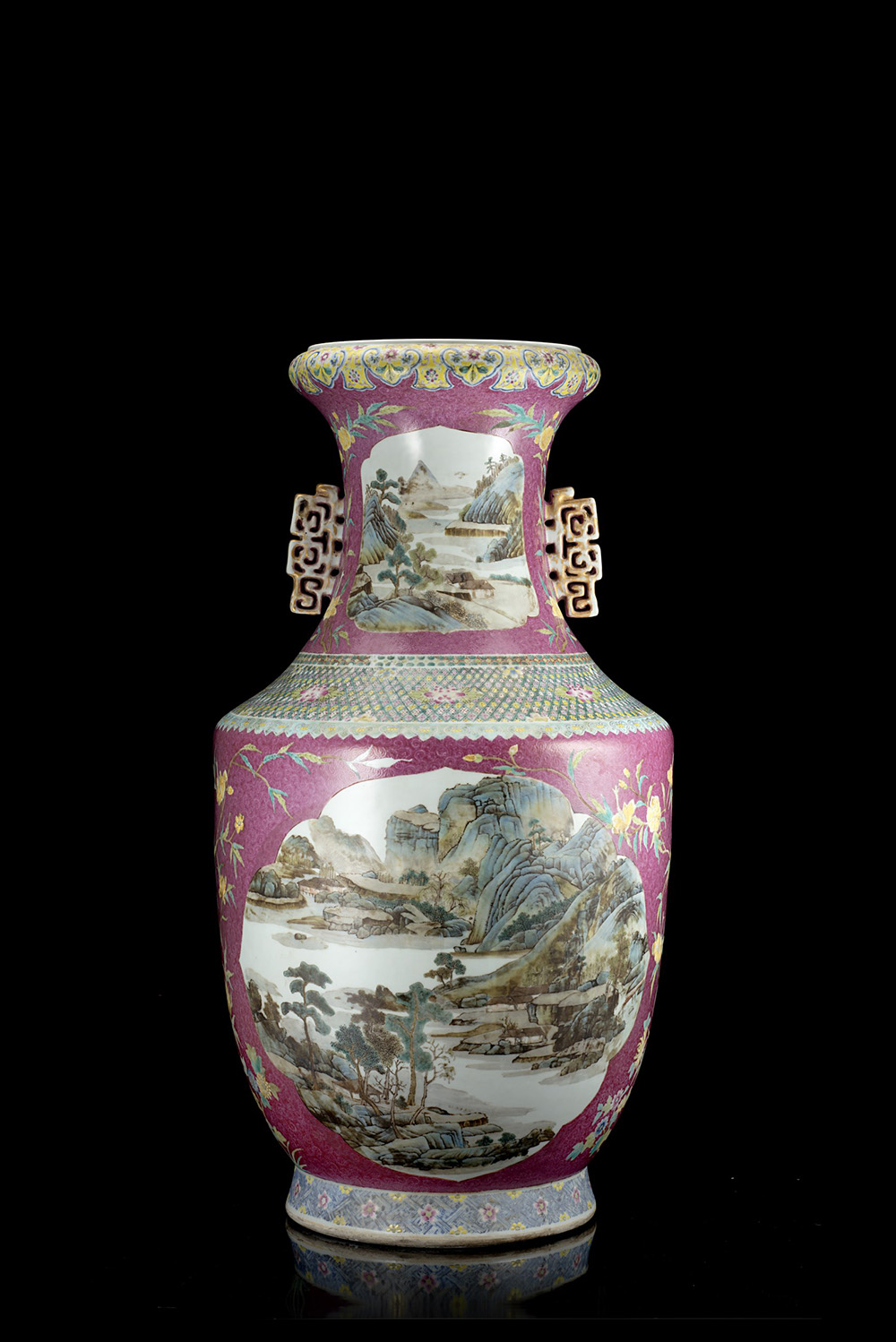 Grande vaso biansato decorato in policromia con paesaggi montuosi e fluviali, contornato da motivi floreali in Famiglia Rosa su fondo color rubino, marchio apocrifo Qianlong alla base