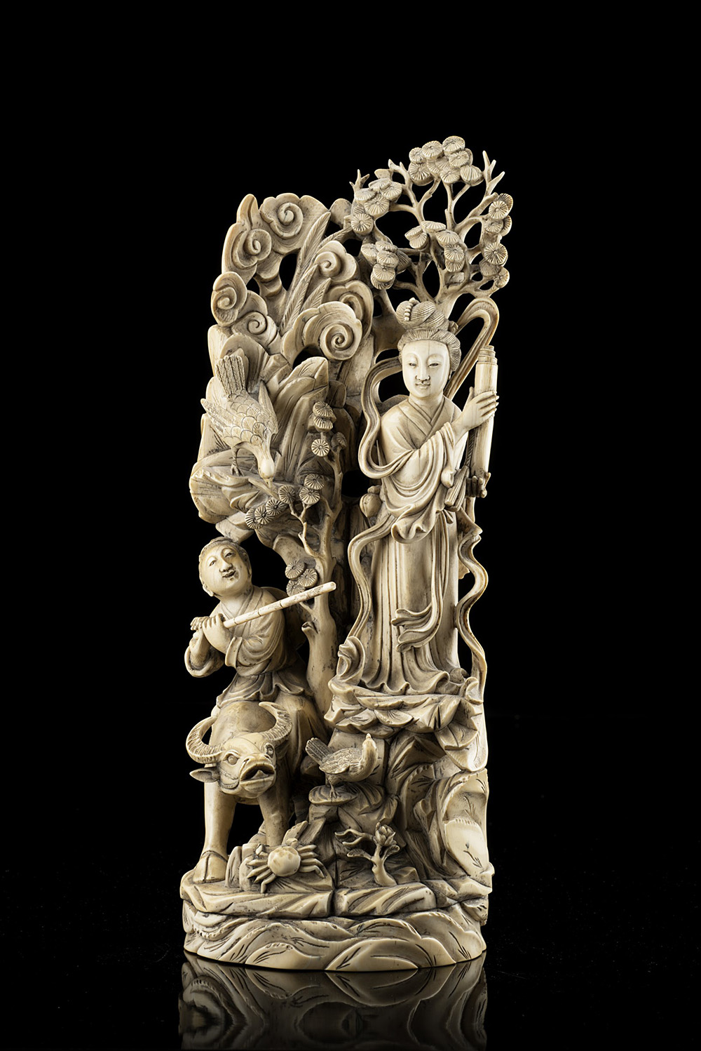 Grande gruppo in avorio scolpito con dama, bufalo e fanciullo tra rami in fiore su base rocciosa (lievi difetti)