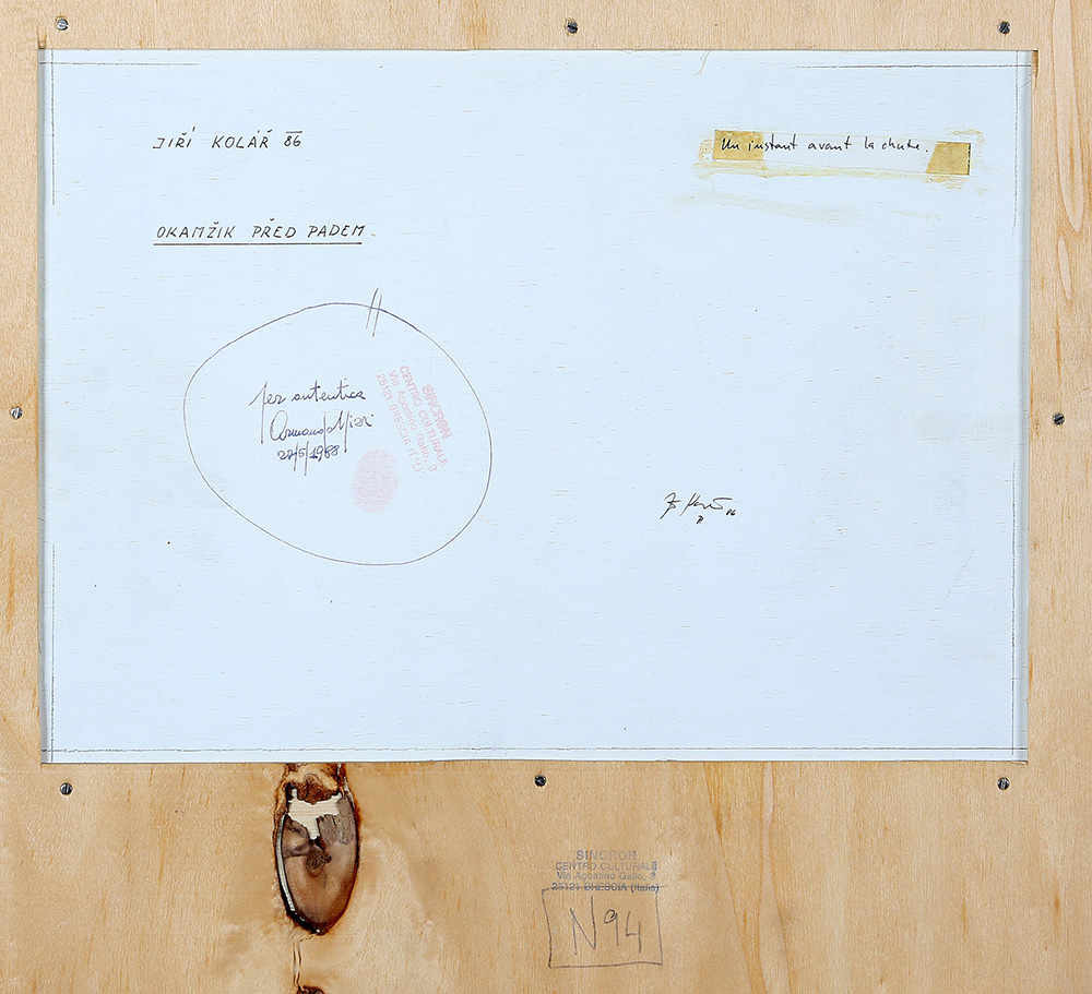 JIRI KOLAR 1914 - 2002 Okamzik Pred Padem, 1986 Collage su tavola, cm. 30 x 39 Firmato e datato sul retro Autentica di Armando Nizzi sul retro Timbro Centro Culturale Sincron, Brescia sul retro Prov. Collezione Privata
