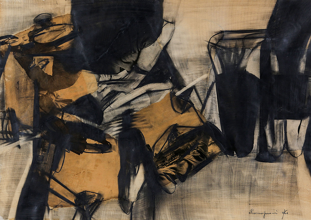 BEPI ROMAGNONI 1930 - 1964 Senza titolo (Racconto), 1962 Tecnica mista e collage su carta, cm. 50 x 70 Firmato e datato in basso a destra L'opera è dipinta sul retro Prov. Collezione Privata