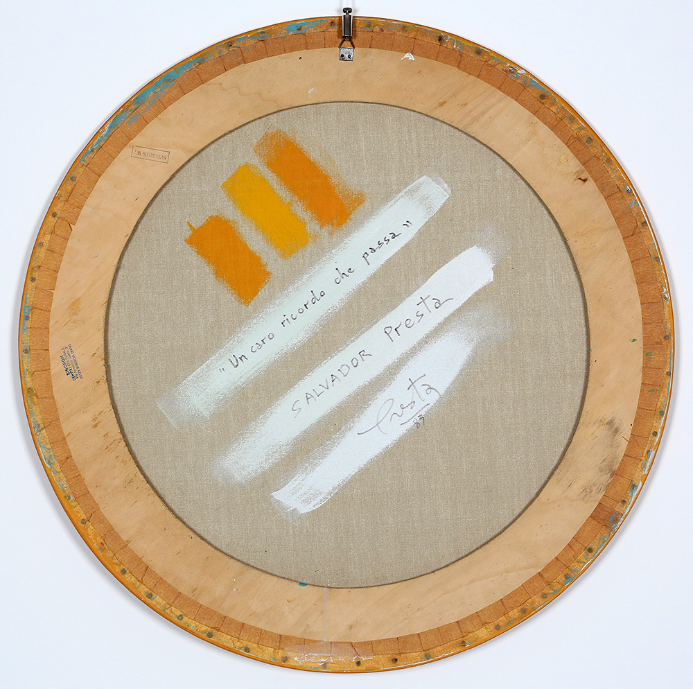 SALVADOR PRESTA 1925 Un caro ricordo che passa, 1983 Collage su tela, diametro cm. 70 Firmato e datato sul retro Timbro Centro Culturale Sincron, Brescia sul retro Timbro Sincron W. sul retro Prov. Collezione Privata