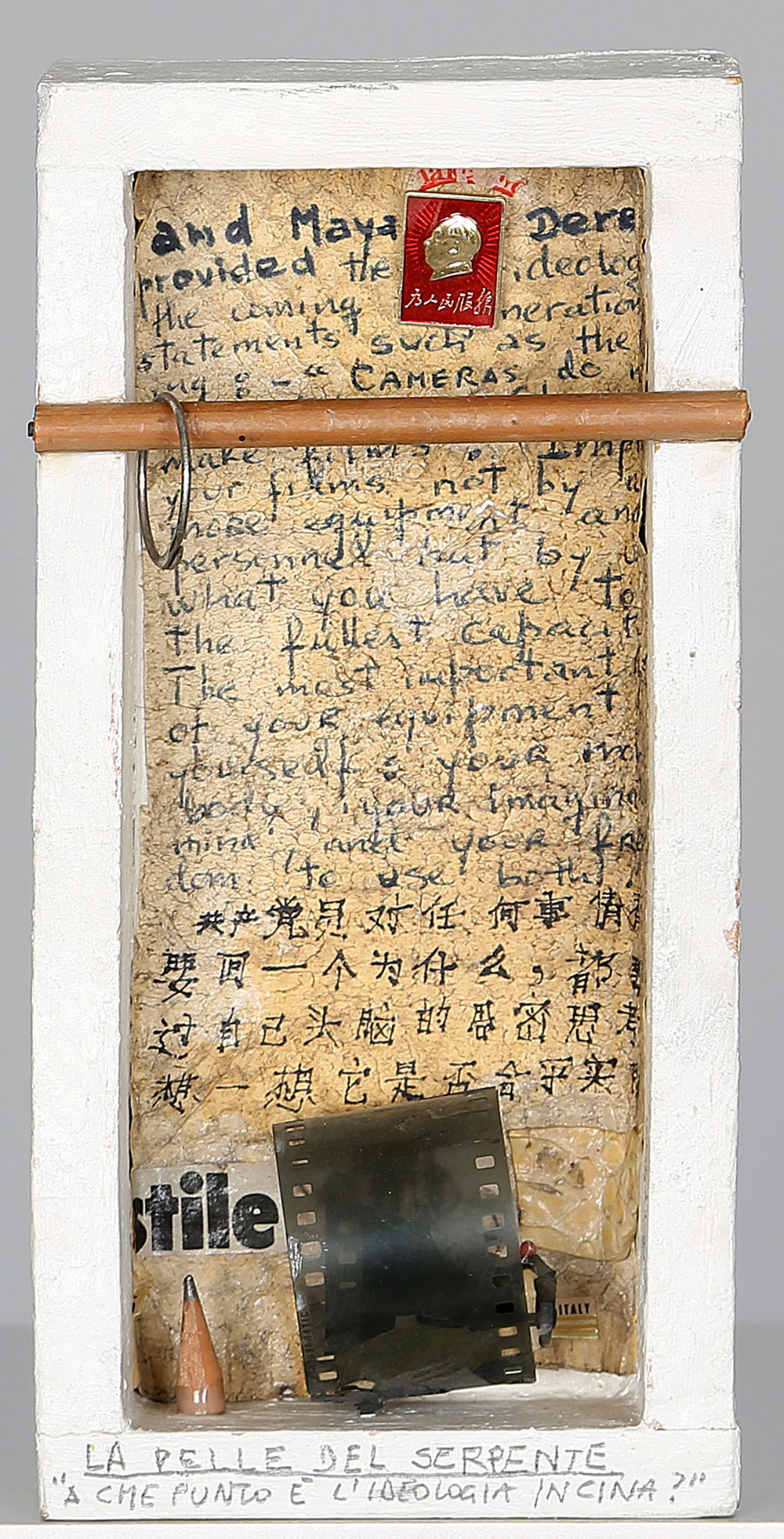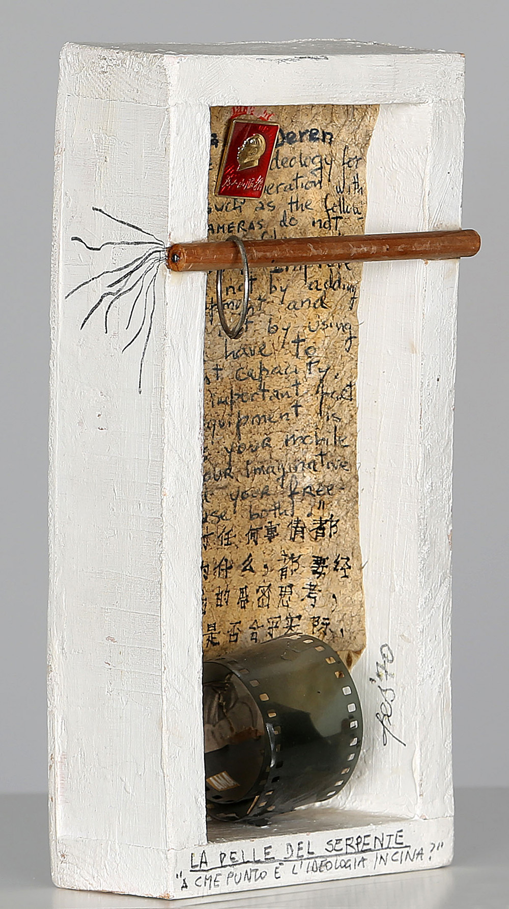 GIANNI EMILIO SIMONETTI 1940 La pelle del serpente. A che punto è l’ideologia in Cina, 1970 Assemblaggio, legno, matita, pellicola, carta, spilla, tecnica mista, cm. 22 x 10,5 x 5 Firmata e datata Autentica dell’artista su fotografia Prov. Collezione Privata