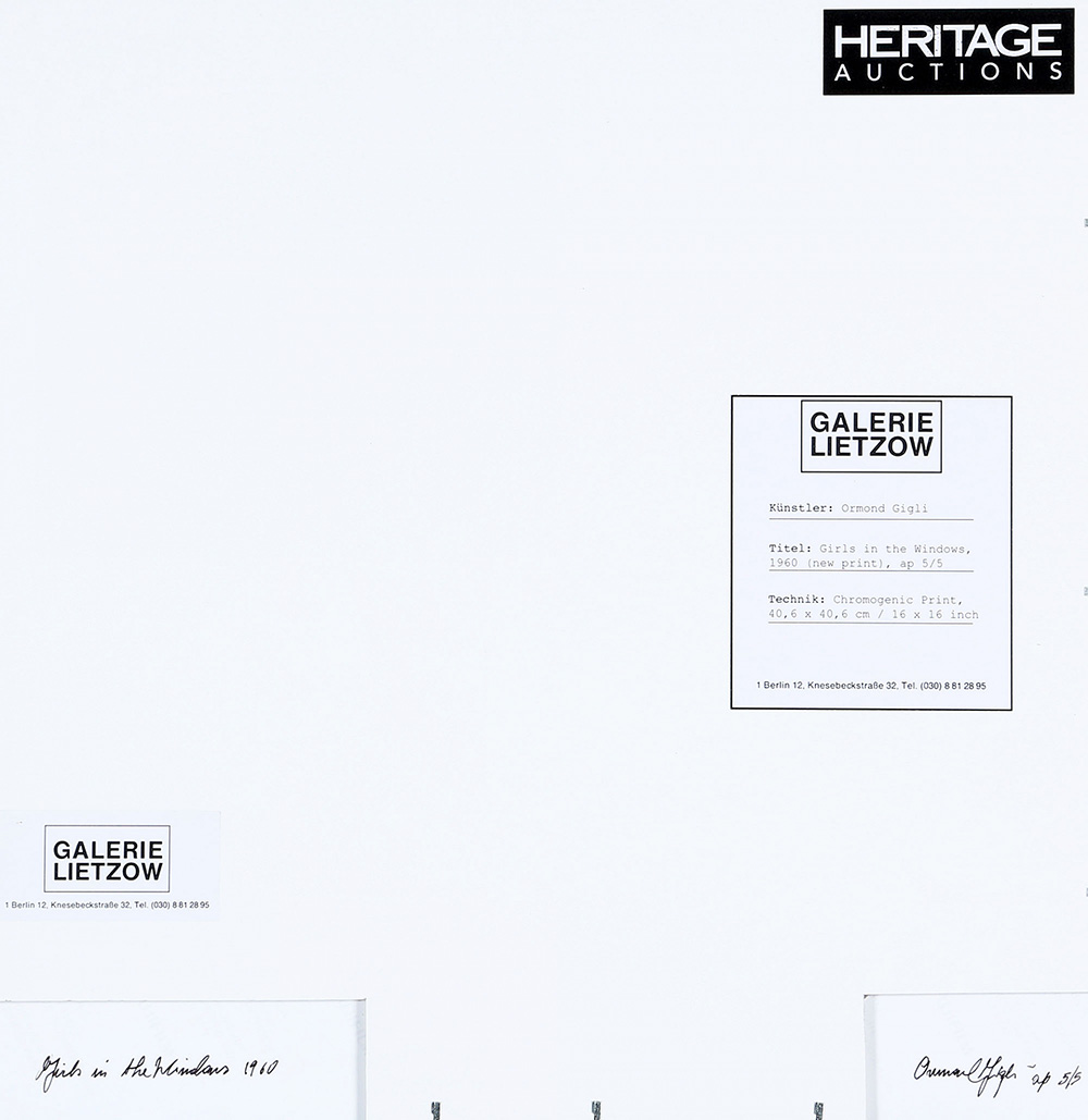 ORMOND GIGLI 1925 Girls in the windows, 1960 Fotografia stampa cromogenica, cm. 41 x 41 Firmata e datata sul retro Opera n. 5/5 Etichetta Galerie Lietzow, Berlino sul retro Etichetta Heritage Auctions sul retro Prov. Collezione Privata