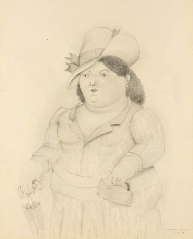 Fernando Botero Medellin 1932 Mujer con paraguas, 1983 Matita e gouaches su carta, cm. 43,7x35,5 Dedica, firma e data in basso a destra: A [...] / Botero 83. Certificato su foto Marlborough Gallery, New York.