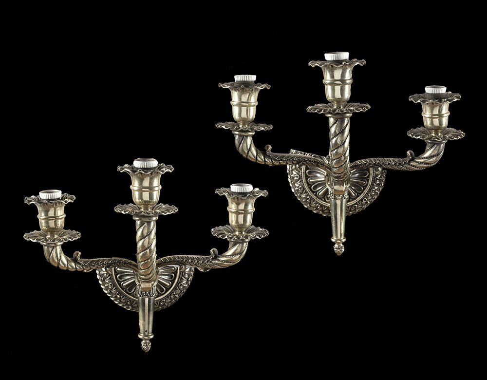 Coppia di appliques in argento a tre fiamme decorate con bracci sagomati a cornucopia, supporto centrale a forma di fuso e attacco a rosetta decorati a motivi fogliacei. Con impianto elettrico. Milano, sec. XX. Argentiere Poli Mario (cm 23x21,5x25,5 ca.) (gr lordi 2540 ca.) (lievi difetti)