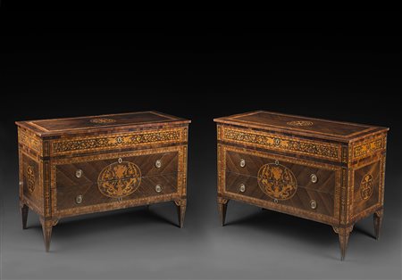 Coppia di comò in noce a tre cassetti lastronati in bois de violette, filettati in bois de rose e decorati da rosoni intarsiati. Cornici, fasce, sagome e montanti riccamente intarsiati a fiori, volute e candeliere su fondo a stucco. Gambe troncopiramidali intarsiate, quelle frontali su tre facce, quelle posteriori su due (cm 123,5x88x58) Lombardia, sec. XVIII (lievi difetti)