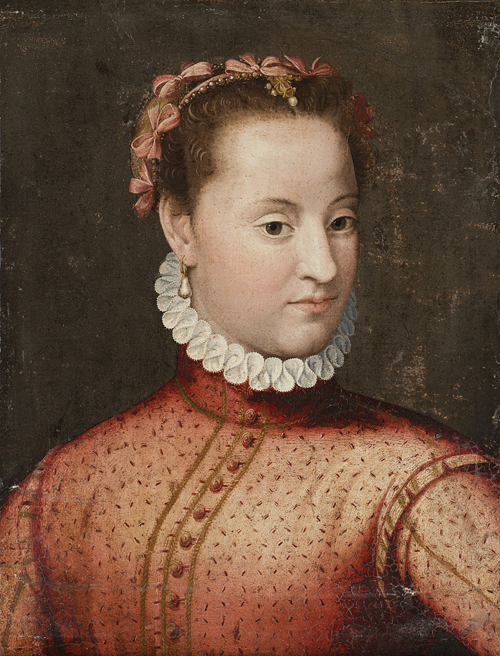 Scuola fiorentina dell'inizio del secolo XVII "Ritratto di dama" olio su tela (cm 51x39) in cornice in legno intagliato e traforato (difetti e restauri)