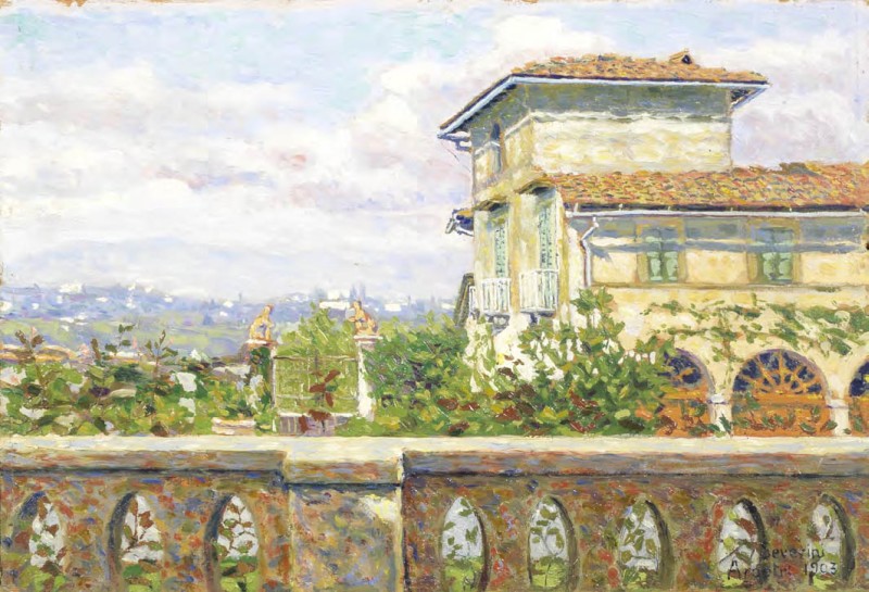 Gino Severini Cortona (Ar) 1883 - Parigi 1966 Villa Passerini presso Firenze (Veduta di Arcetri), 1903 Olio su tavola, cm. 26,4x38 Firma e data in basso a destra: Severini / Arcetri 1903. Certificato su foto di Gina Severini Franchina, Roma 21/7/89. Esposizioni: Esposizione personale di Gino Severini, Cortona, Palazzo Casali, 1976. Bibliografia: Piero Pacini, Percorso prefuturista di Gino Severini, 3, in «Critica d'arte», anno XL, n. 139, gennaio - febbraio 1975, p. 43, tav. 2; Daniela Fonti, Gino Severini. Catalogo ragionato, Mondadori - Daverio, Milano, 1988, p. 75, n. 14.