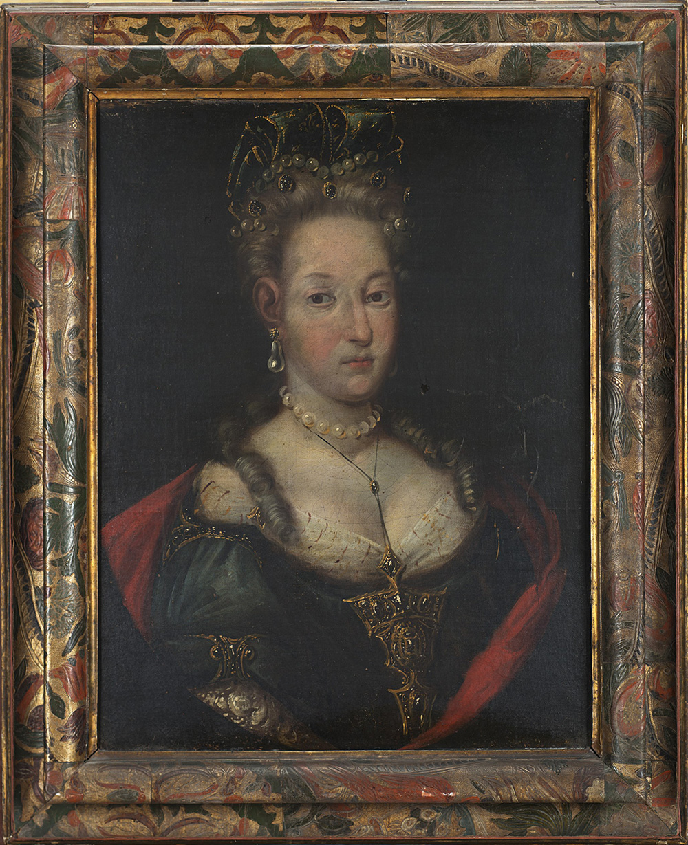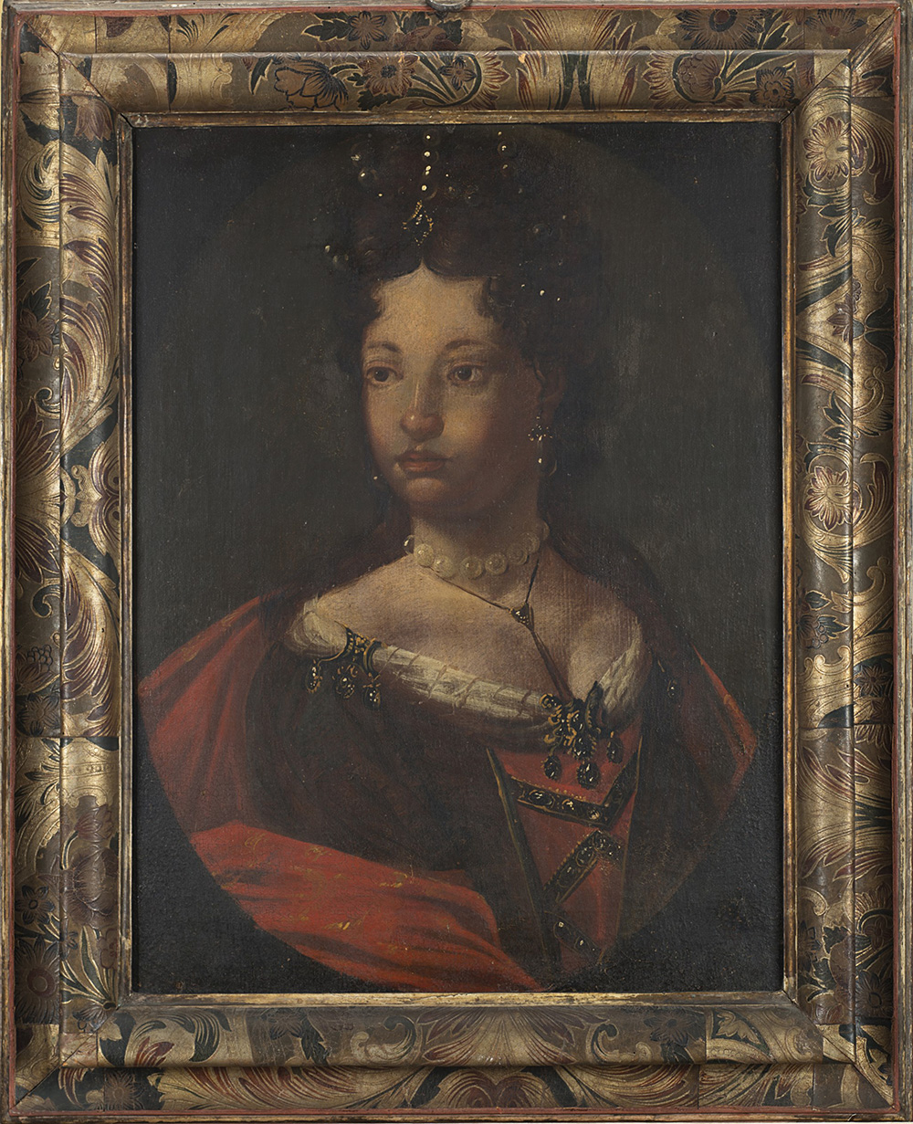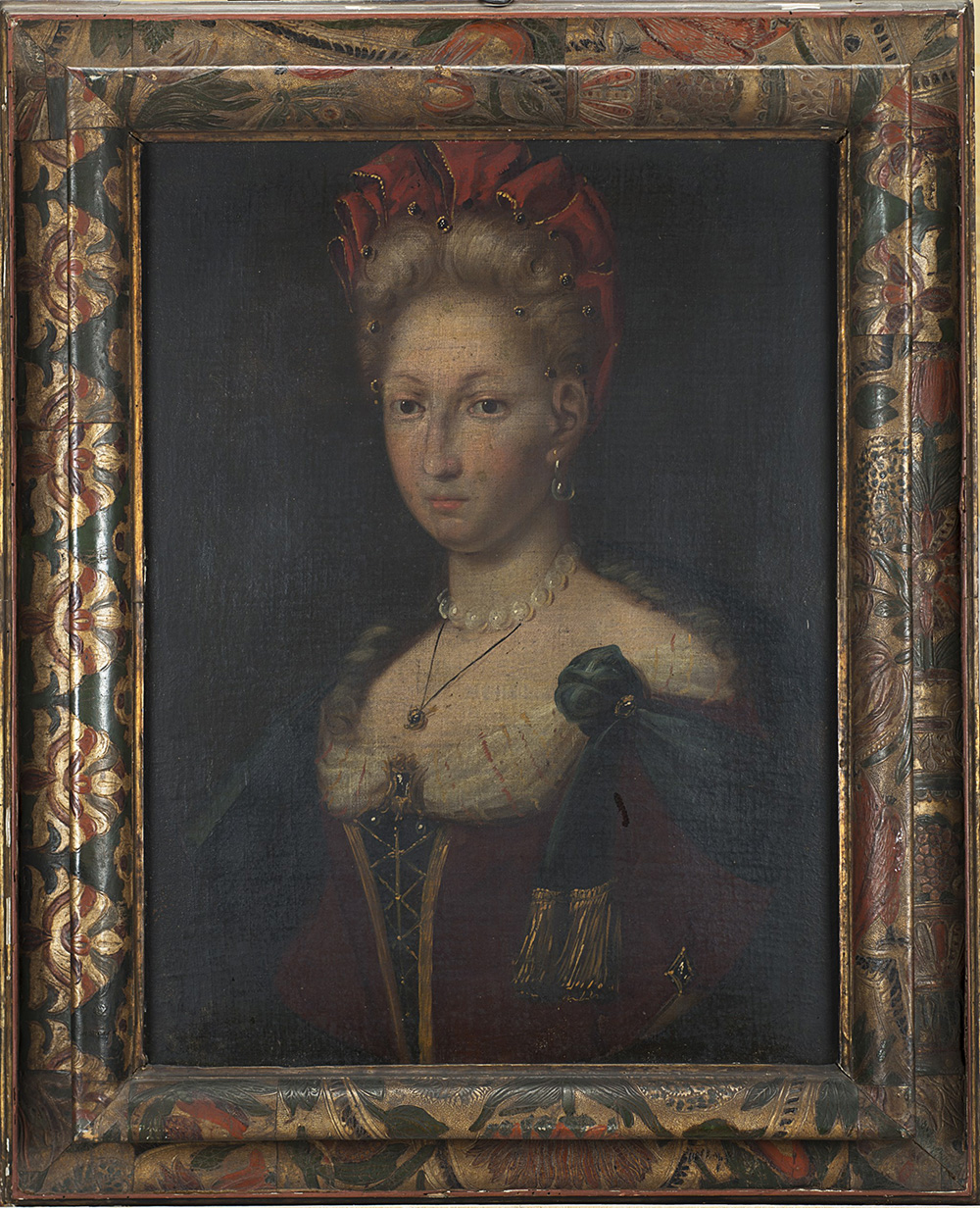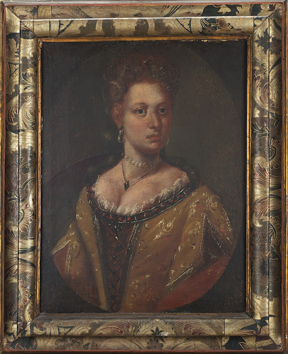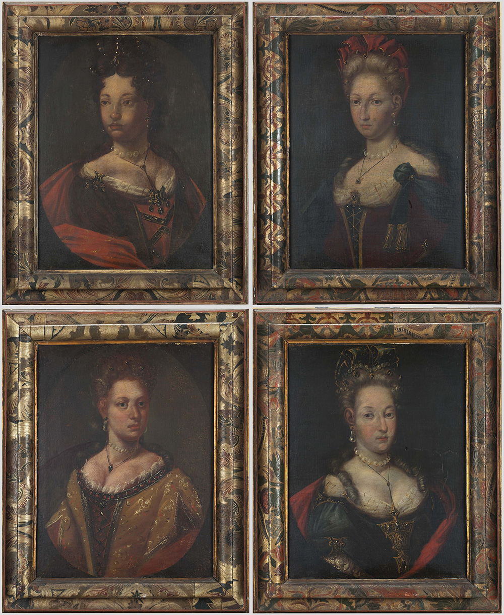 Tuscan School, late 17th century, four portraits of ladies with 17th century leather frame (defects and restaurations)