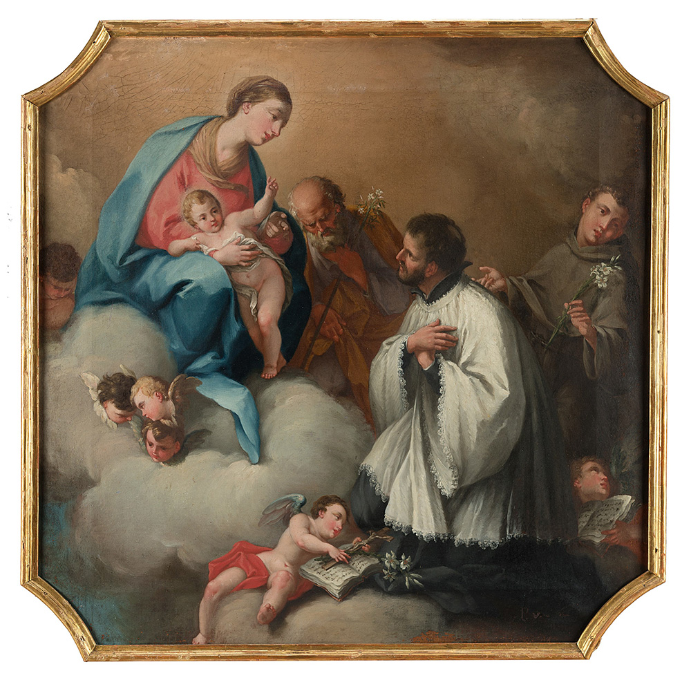 Antonio Balestra (attribuited to) "Virgin, Child, St. Joseph, St. Anthony of Padua and St. Francis Saverio" oil on canvas (cm 107x108) framed (defects)