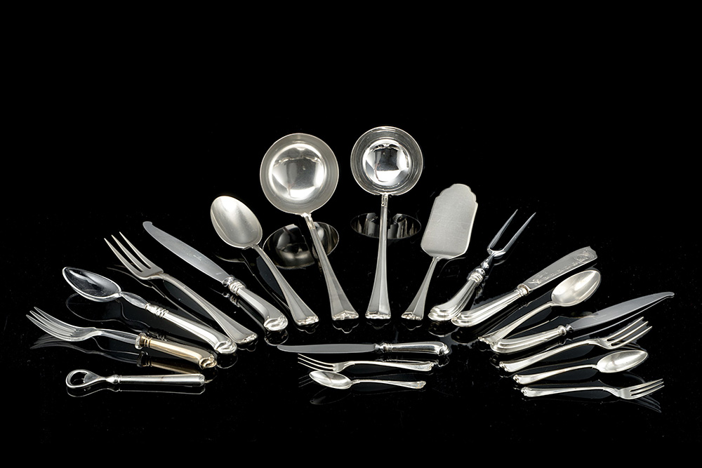 Servizio di posate in argento San Marco composto da: sedici forchette da tavola, diciotto cucchiai da tavola, diciotto coltelli da tavola, venticinque forchette da frutta, ventisei coltelli da frutta, dodici forchette da frutta, dodici cucchiai da frutta, dodici forchette da dolce, dodici cucchiai da tè, dieci posate da portata e un cavatappi. Italia, sec. XX (gr 6500 ca.)