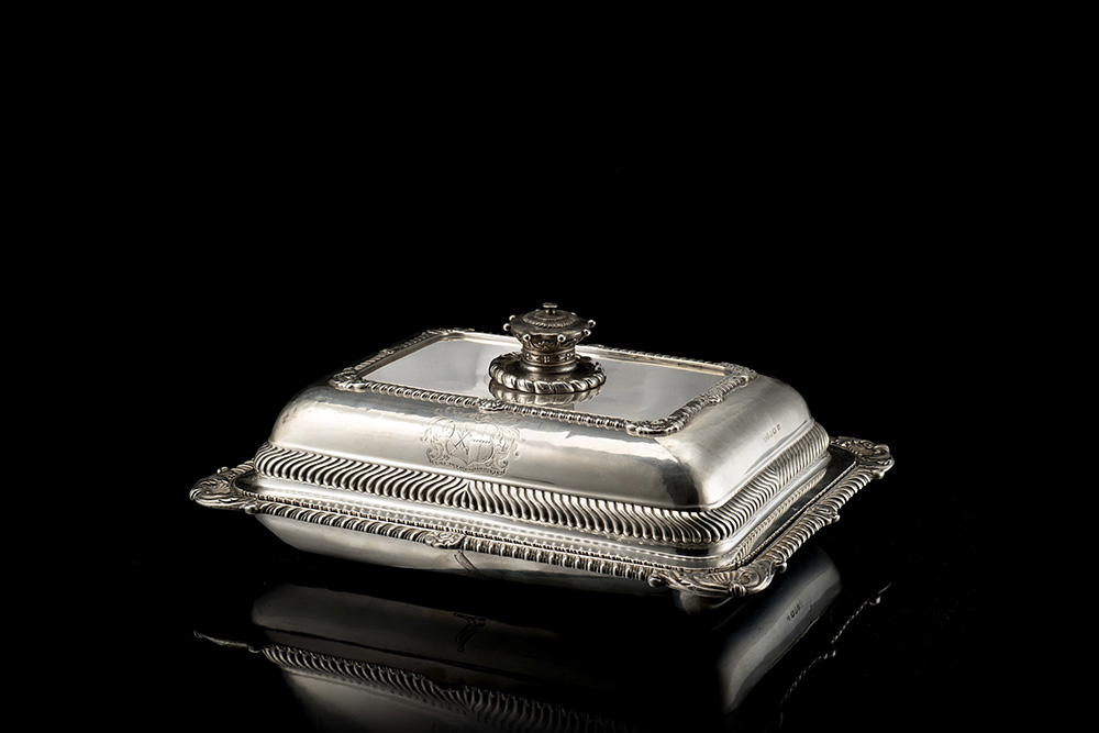 Legumiera in argento di forma rettangolare, decorata con profili a conchiglie fogliate e godroni; stemma con motto ‘CUM PARVO GLADIO VICI’, inciso sul coperchio. Londra, 1813, possibile argentiere John Hawkins & William Houce (cm 30,5x23,5xh. 12,5 ca.) (gr 2200 ca.) (difetti)