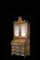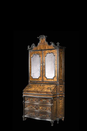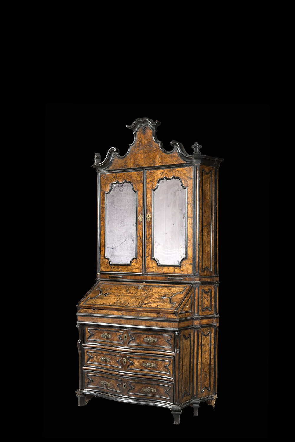 Trumeau lastronato in noce e radica di noce con profili e sagomette ebanizzate, parte superiore a due ante a specchio e cimasa sagomata, parte inferiore con fronte e fianchi mossi a tre cassetti e anta ribaltabile celante cassetti e vano. Piedi rastremati. Lombardia, sec. XVIII (cm 120x253x60) (difetti e restauri)