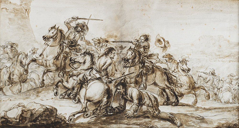 "Zuffa di cavalieri" disegno su carta a matita nera e inchiostro bruno disteso a penna con ombreggiature in inchiostro bruno disteso a pennello (mm 237x443) in cornice