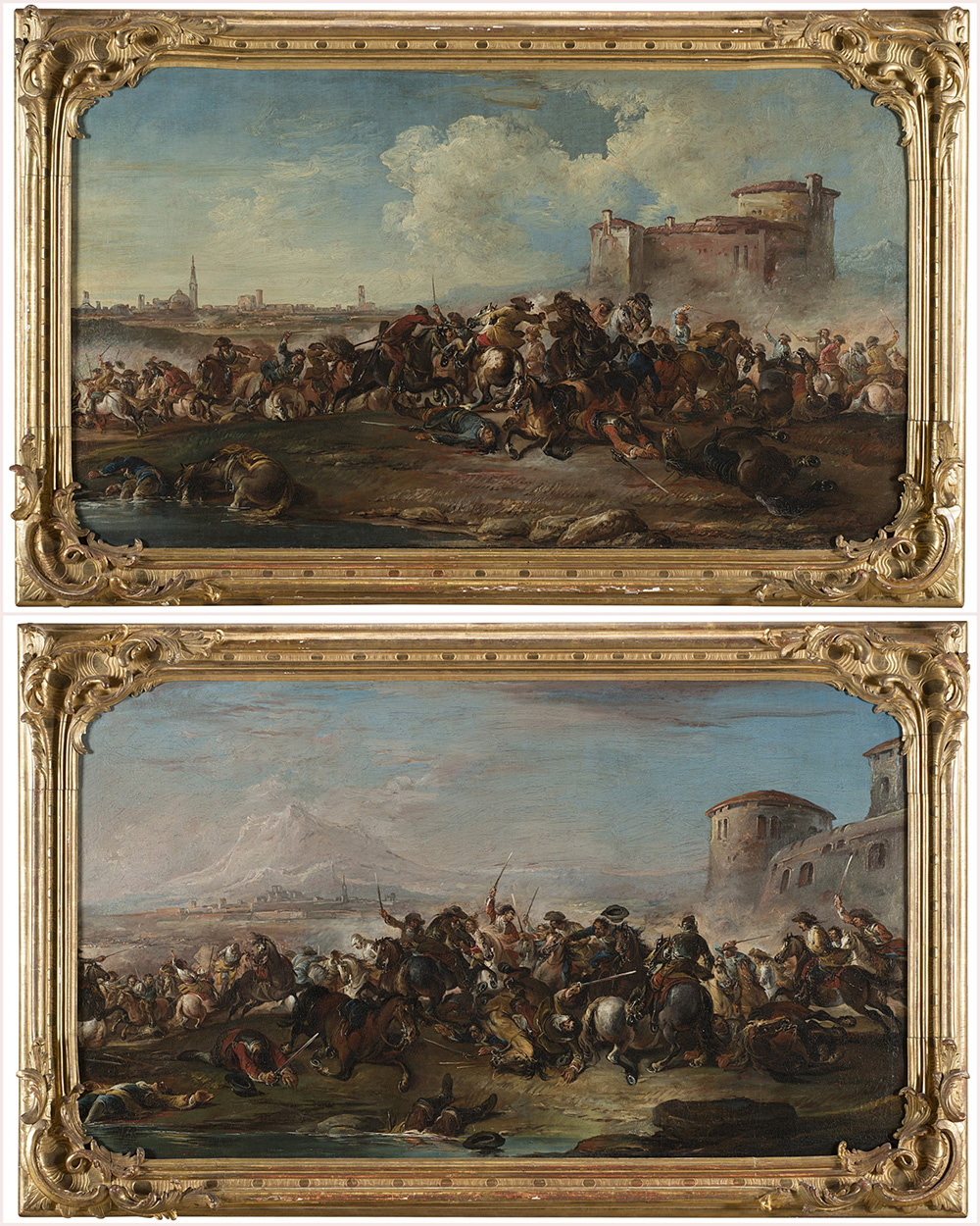 Francesco Antonio Simonini "Battle between knights" two oil on canvas (cm 79x136) framed