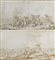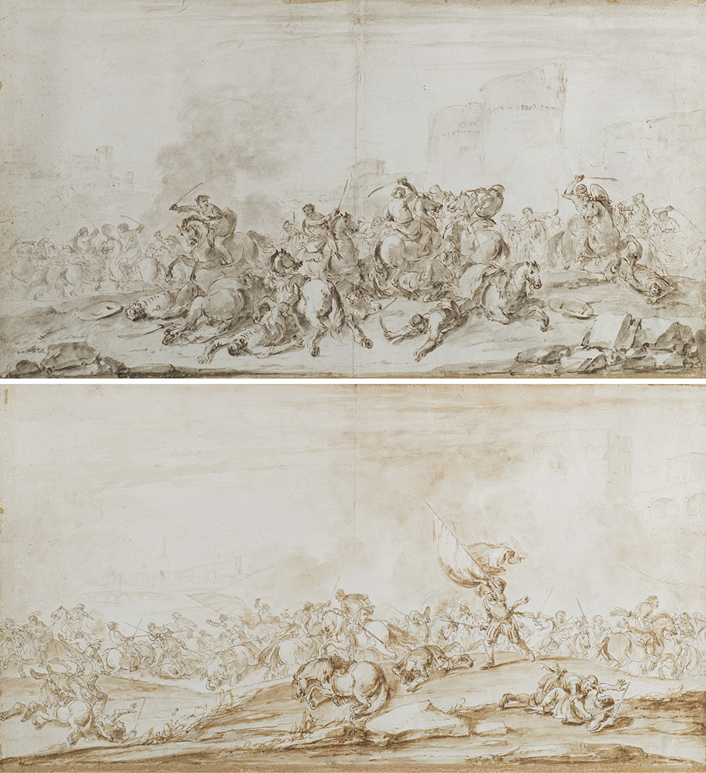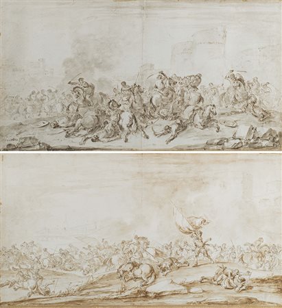 "Zuffa di cavalieri sullo sfondo di una città fortificata con un alfiere con una bandiera in mano e due uomini a terra che vogliono uccidersi" e " Zuffa di cavalieri sullo sfondo di una città fortificata" coppia di disegni su carta a matita nera e inchiostro bruno disteso a penna con campiture in inchiostro bruno disteso a pennello (mm 415x755) in cornice