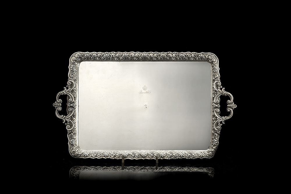 A two-handle silver tray. Ottoman Empire, late 19th century - early 20th centuty. Signed Ibraaim Helmy (cm 58x35) (gr 1900 ca.) (defects)