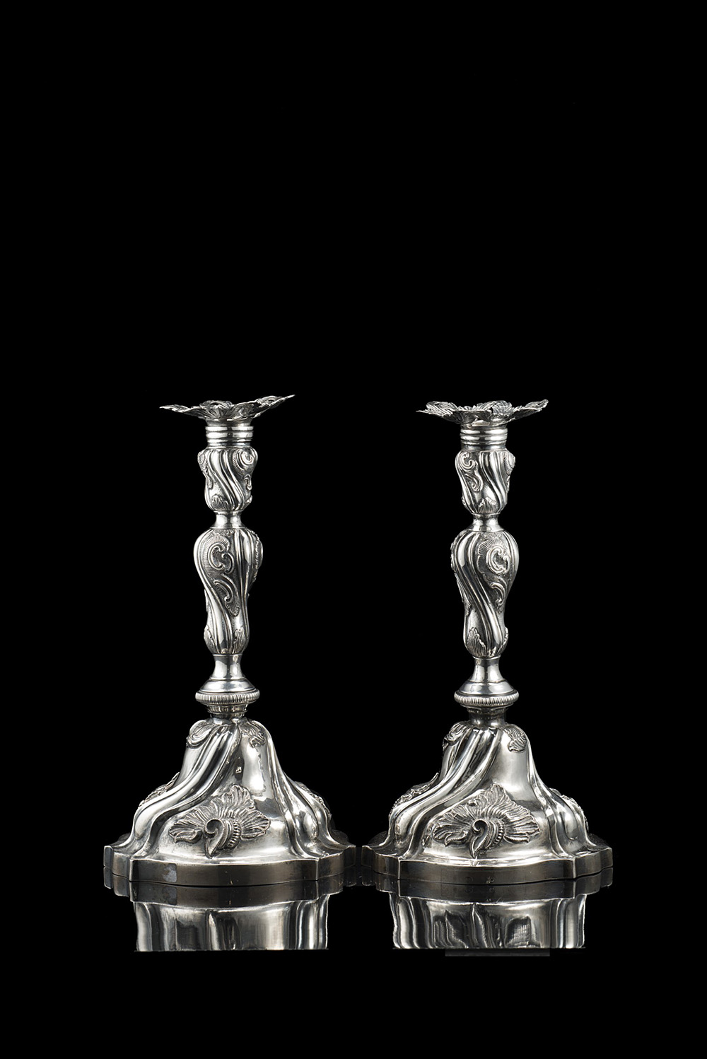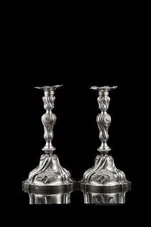 Coppia di candelieri in argento con piede mistilineo, fusto a balaustro e bobeches traforate, decorati a nervature tortili, volute e ‘pelacette’. Regno di Sardegna, Zecca di Genova, 1825-73 (h. cm 25 ca.) (gr tot 900 ca.) (difetti)