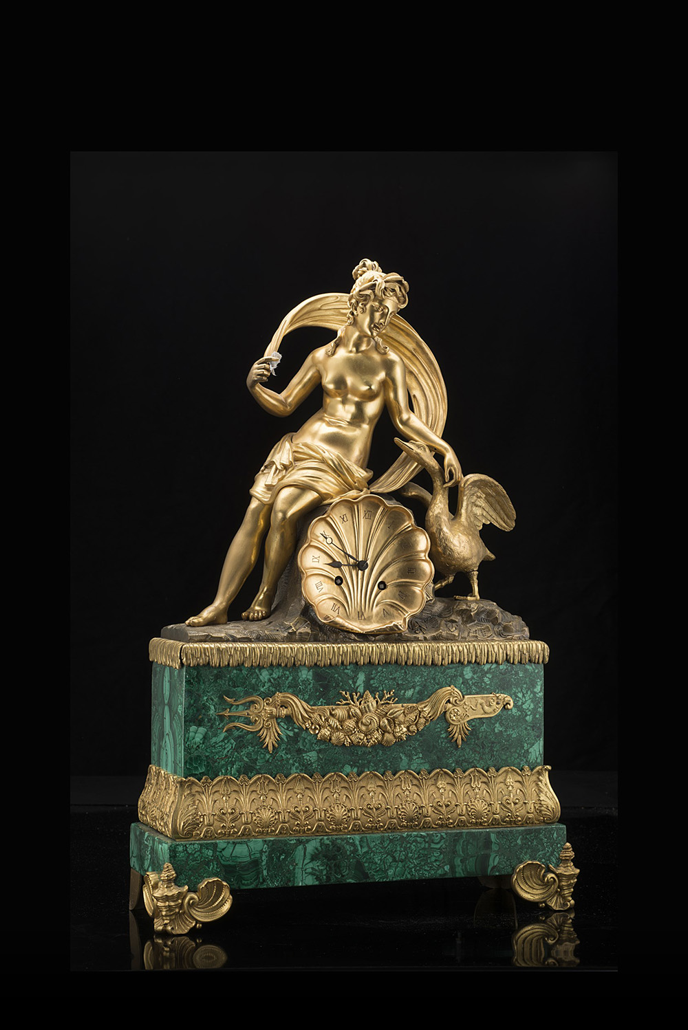 Pendola in bronzo con base lastronata in malachite e sormontata da Leda e il cigno