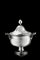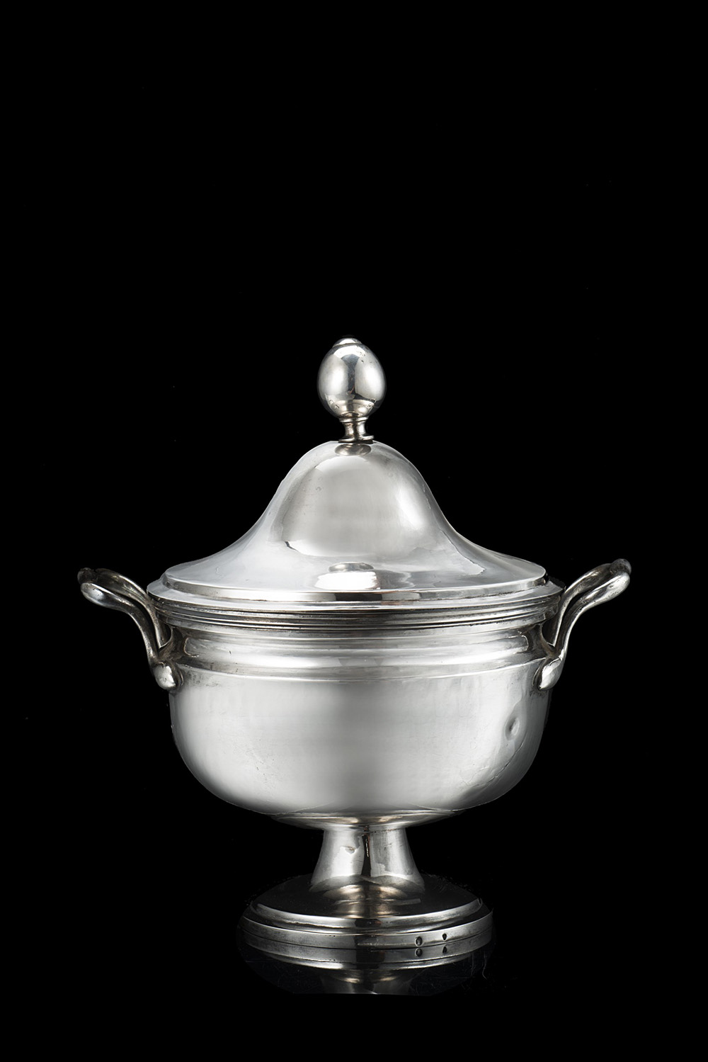 Zuppiera in argento, a due manici, con corpo circolare liscio su piede e coperchio a cupola, gradinati; pomolo ovoidale. Regno di Sardegna, Zecca di Torino, 1824-73, argentiere Giuseppe Col (lungh. cm 27,5 ca.; h. max cm 29 ca.) (gr 1420 ca.) (difetti)