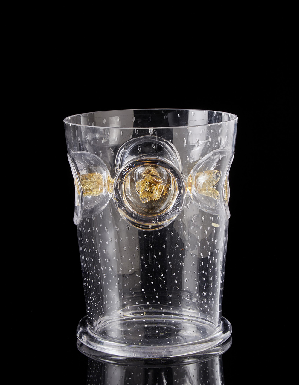 Vaso modello "Albaret". Produzione Driade Kosmo, Milano, anni 90. Vetro incolore soffiato e a bolle con applicazione di foglie in vetro pagliesco (h. cm 26)