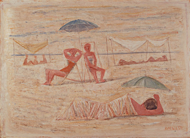Massimo Campigli Berlino 1895 - St.Tropez 1971 Donne sulla spiaggia, 1954 Olio su tela, cm. 81,4x111,4 Firma e data in basso a destra: Campigli 54. Certificato su foto di Nicola Campigli, Saint Tropez 18/10/2007, con n. 543901143. Esposizioni: Omaggio a Massimo Campigli, Galleria d'Arte Moderna F. Falsetti, Cortina d'Ampezzo, 26 dicembre - 10 gennaio 1974, cat. tav. XII, illustrato.