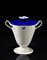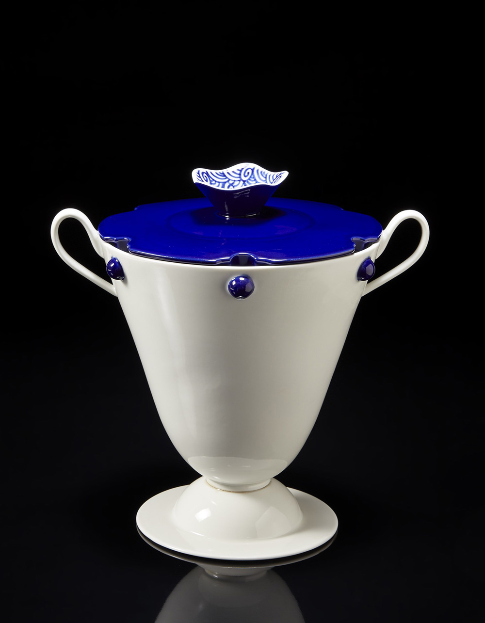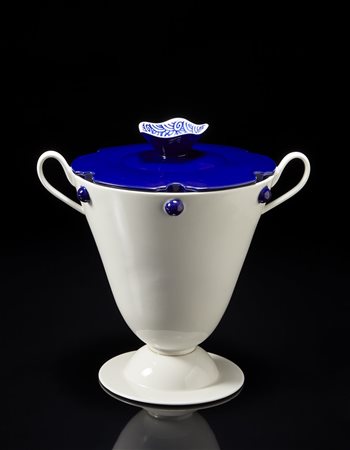 . Vaso biansato in ceramica bianca con coperchio e bugne in blu cobalto (h. cm 34)