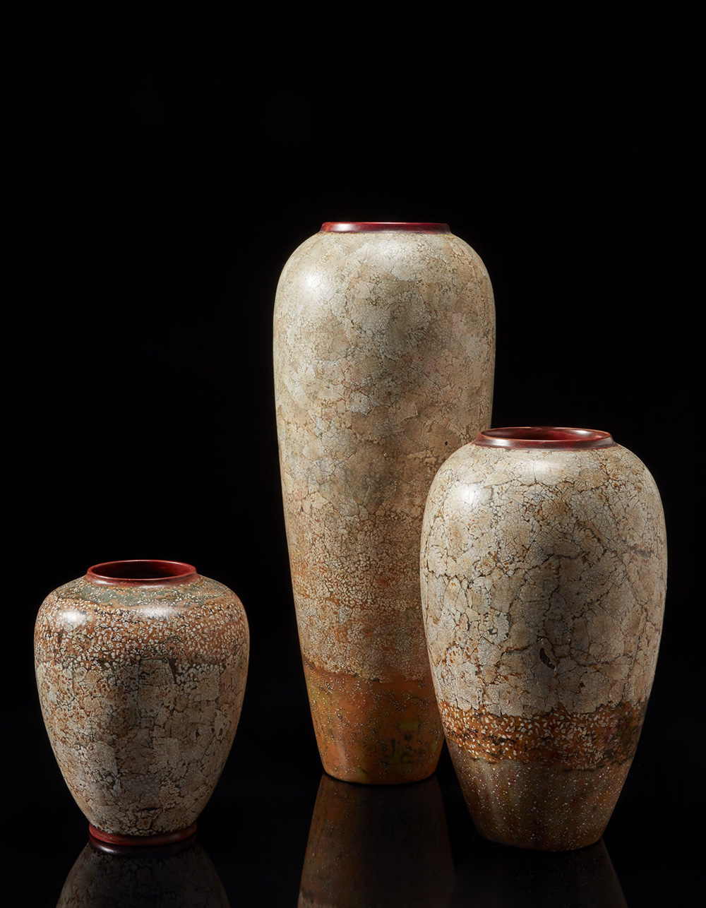 Gruppo di tre vasi in terracotta decorata in policromia (h. max cm 60)...