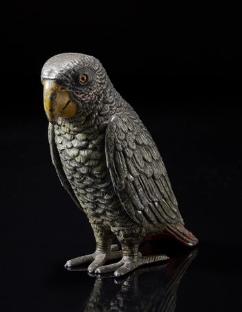 Manifattura austriaca (?) inizio sec. XX. Pappagallo in metallo smaltato a freddo con occhi in pasta vitrea (h. cm 15,5) (difetti e restauri)