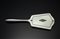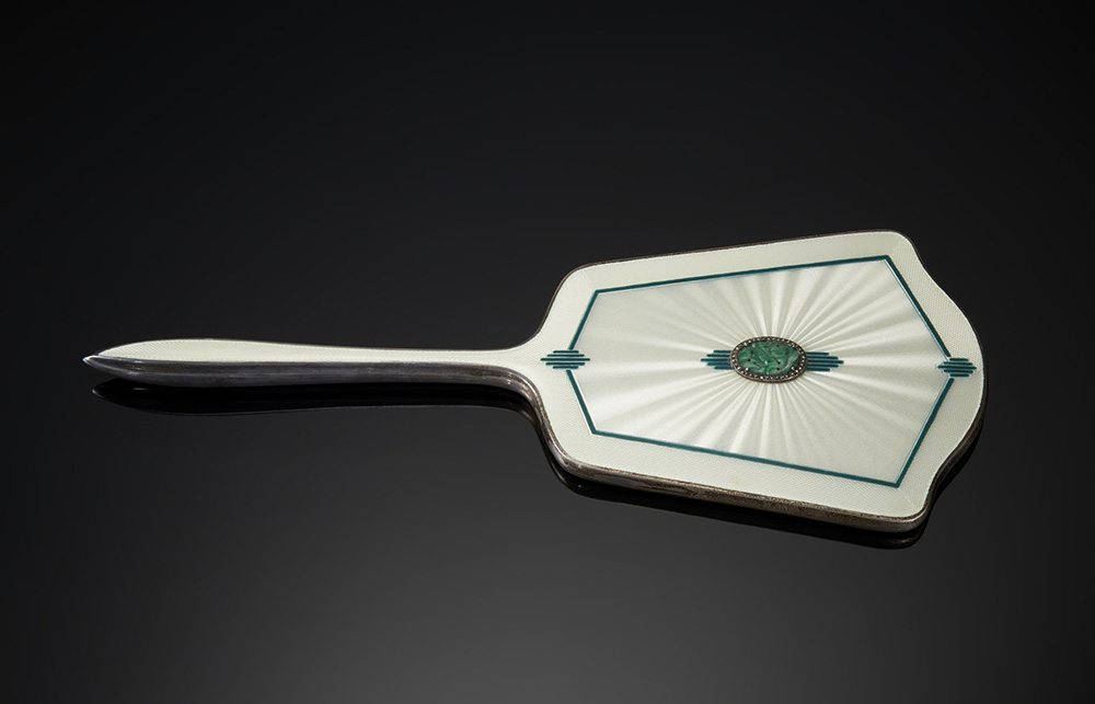 Specchio a mano in argento decorato a guilloché e smalto traslucido con placchetta in giada traforata entro cornice a finti brillantini. Birmingham, 1937 (lungh. cm 27) (difetti)