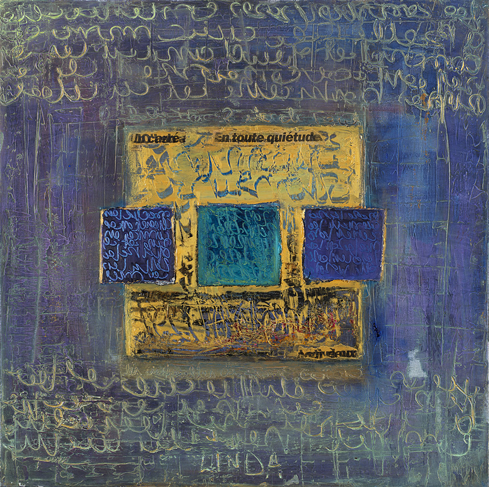 Ignoto "Composizione" olio e tecnica mista su tela (cm 100x100) iscritto Linda in basso al retro