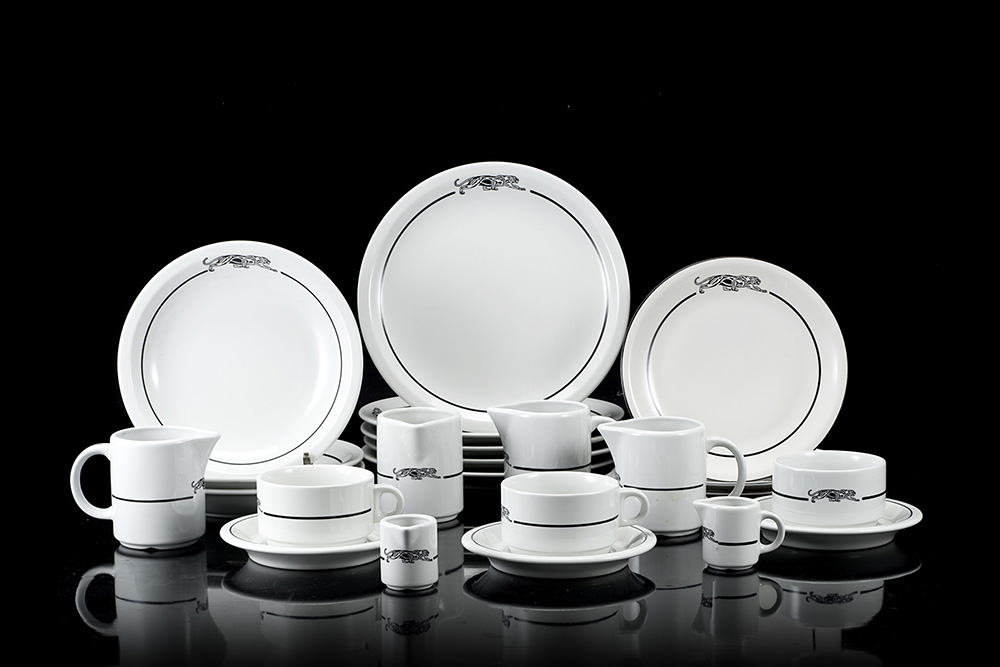 Krizia per Tognana, servizio di piatti per trentasei persone in porcellana bianca decorata nel bordo con pantera. Composto da: settantadue piatti piani, trentasei fondine, trentasei piattini da frutta, trentasei da pane, ventiquattro piatti a servire di forma ovale, trentasei tazze con piattini, trentasei lattiere e trentasei piatti da dolce (lievi difetti)