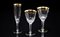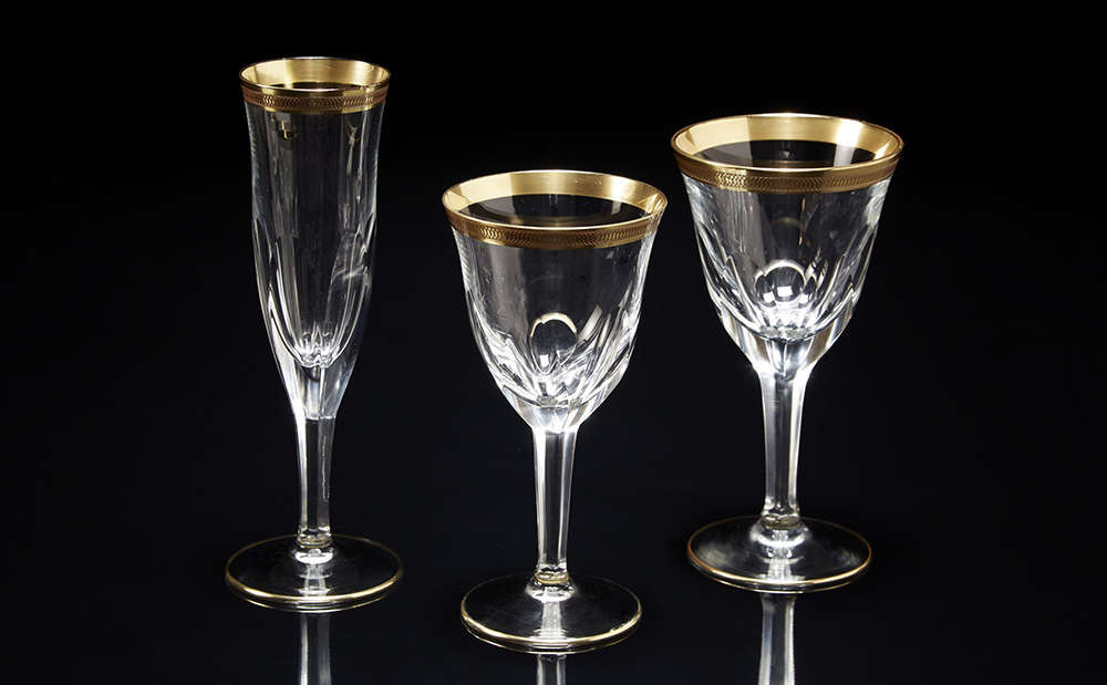 Manifattura cecoslovacca. Servizio di bicchieri in vetro con bordi dorati decorati a motivi concatenati stilizzati. Composto da: flutes, bicchieri da acqua e da vino rosso. Uniti a alcuni bicchieri di ricambio (difetti)