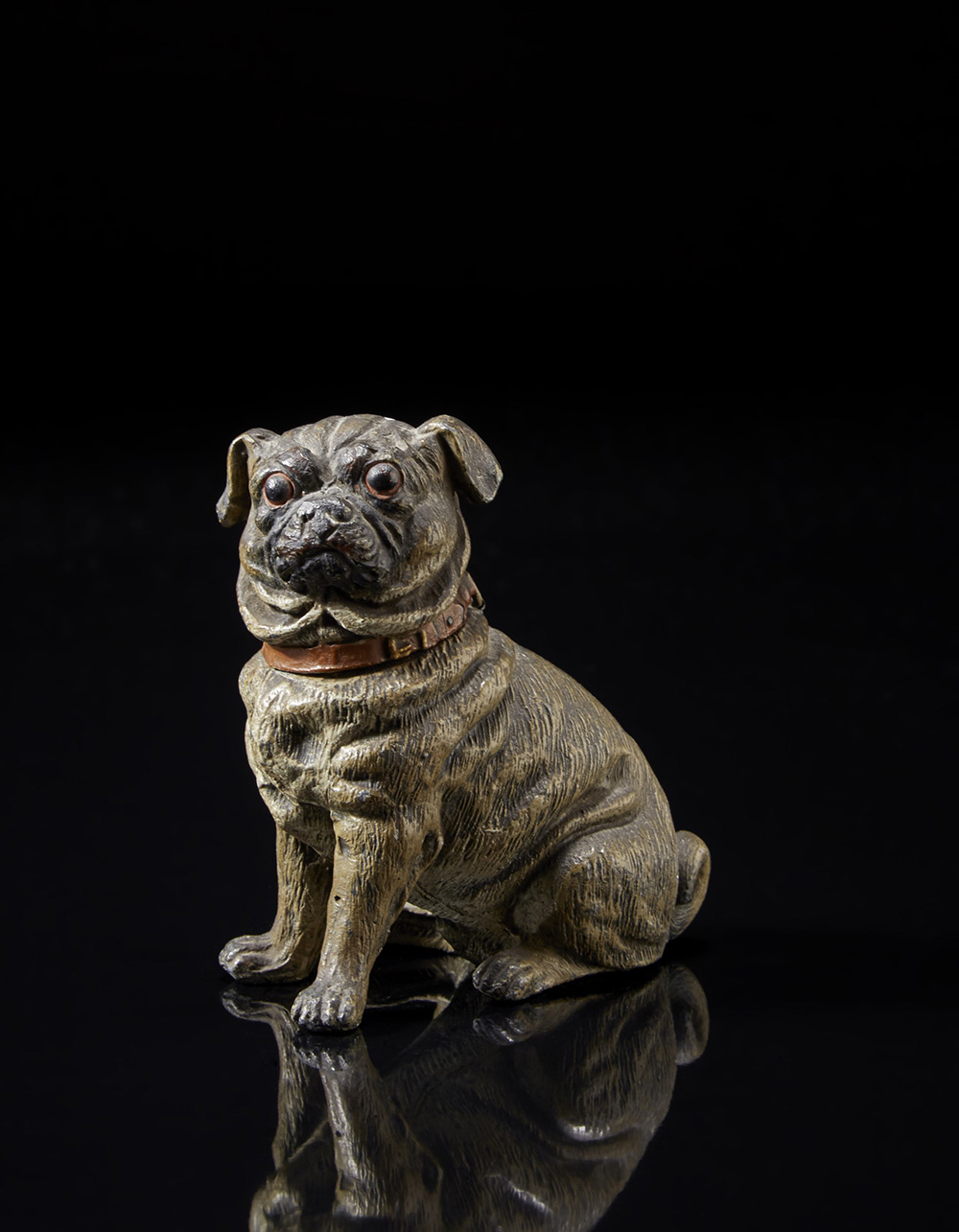 Manifattura austriaca (?) Fine sec. XIX. Calamaio in metallo smaltato a forma di carlino (h. cm 11)
