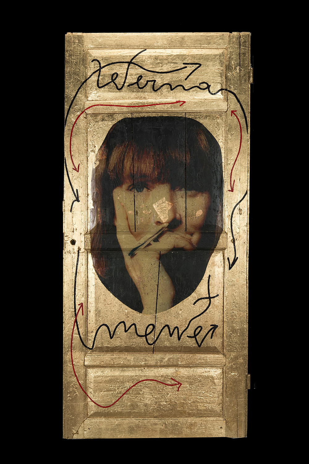 "Senza titolo" porta in legno dipinto a foglia d'oro con fotografia ritoccata e dedica (cm 204x95) (difetti)