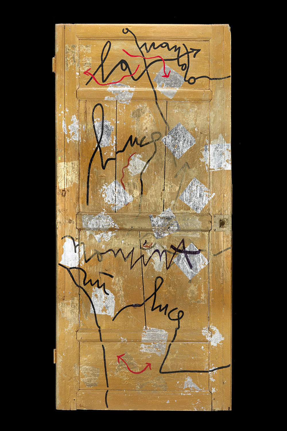 "Senza titolo" a gold leaf decorated wooden door with a photograpy and inscription (cm 204x95) (defects)