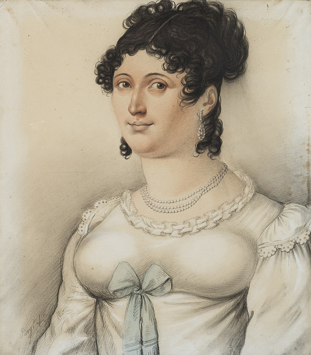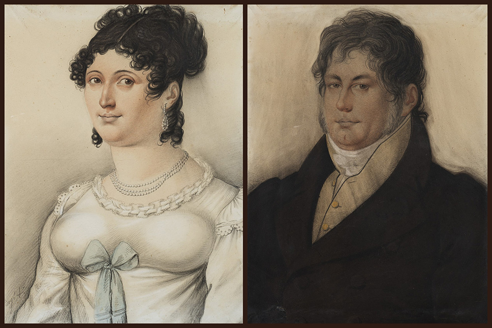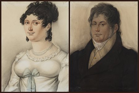 Scuola francese sec. XIX "Gentiluomo" e "Gentildonna" coppia di tecniche...