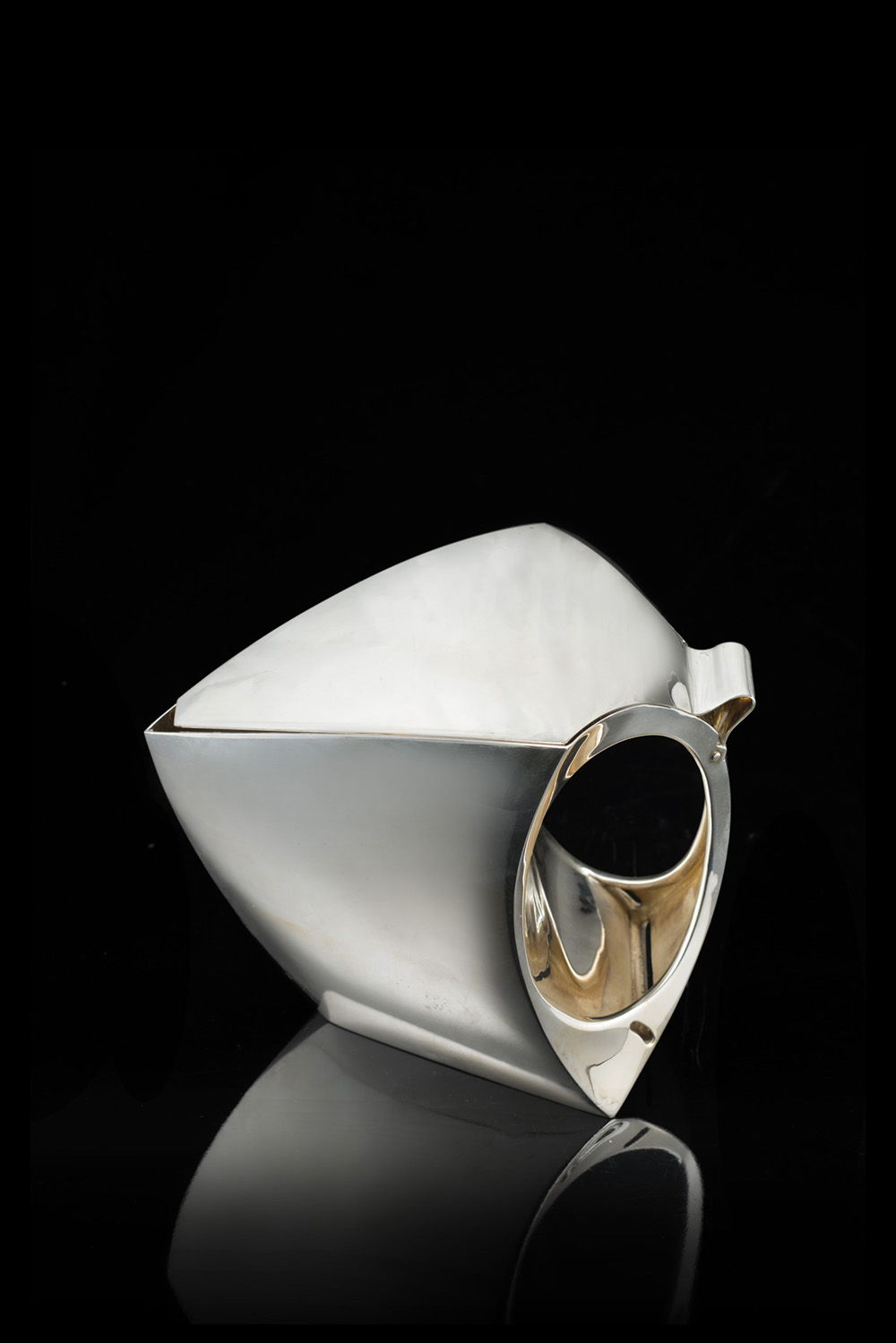 Teiera in argento di forma triangolare e superficie liscia firmata, datata e...