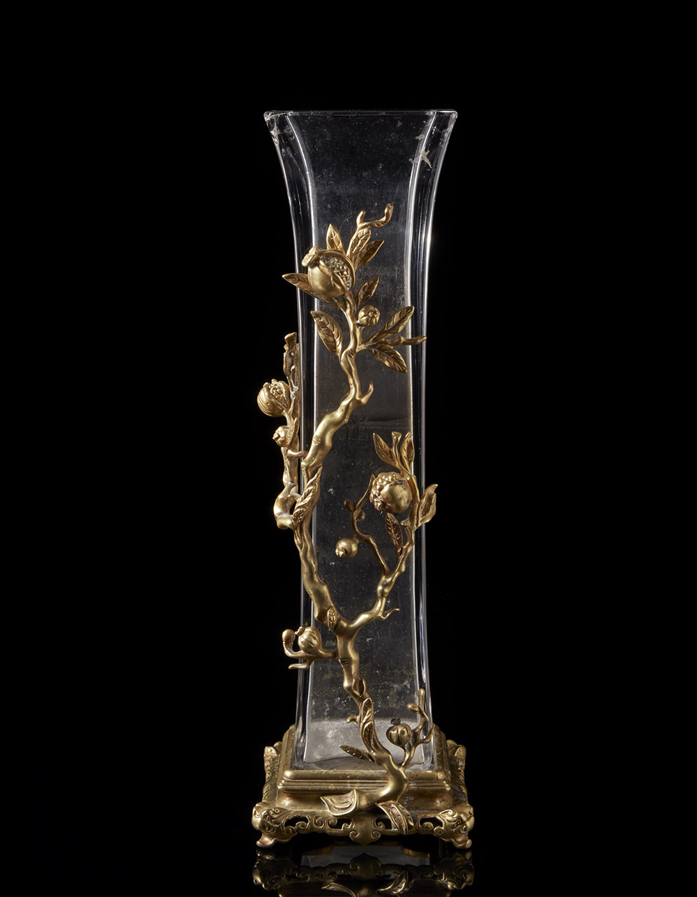 Manifattura francese. Vaso di forma squadrata con base in bronzo decorata con albero di melograni su ramo. Inizi del sec. XX (h. cm 50). Marcata "Benotte Paris" (difetti)