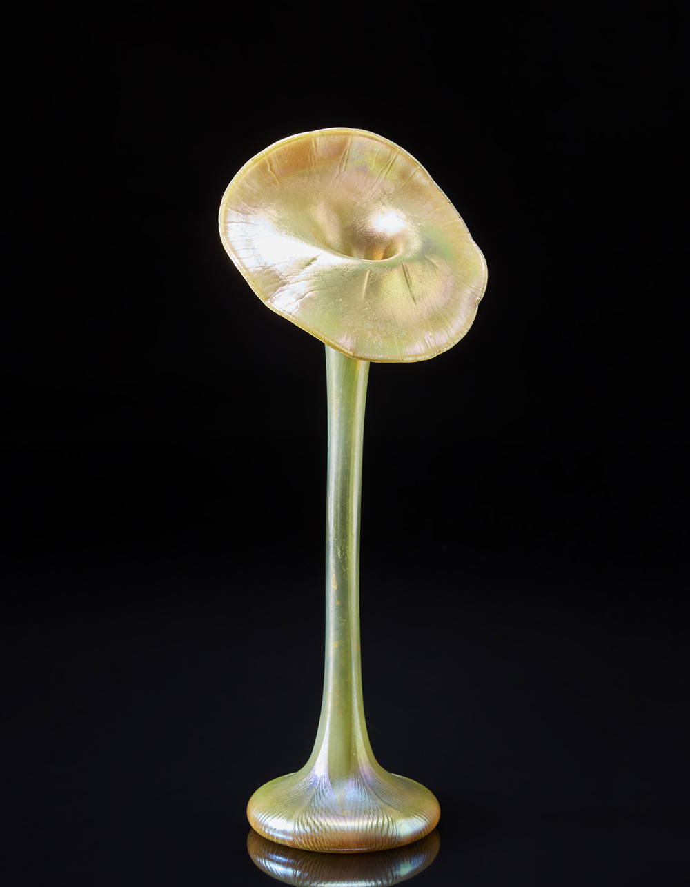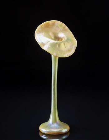 Vaso modello "Jack-in-the-pulpit" in vetro iridescente. Inizi del sec. XX (h cm 36). Inscritto alla base "Quezal N.Y."