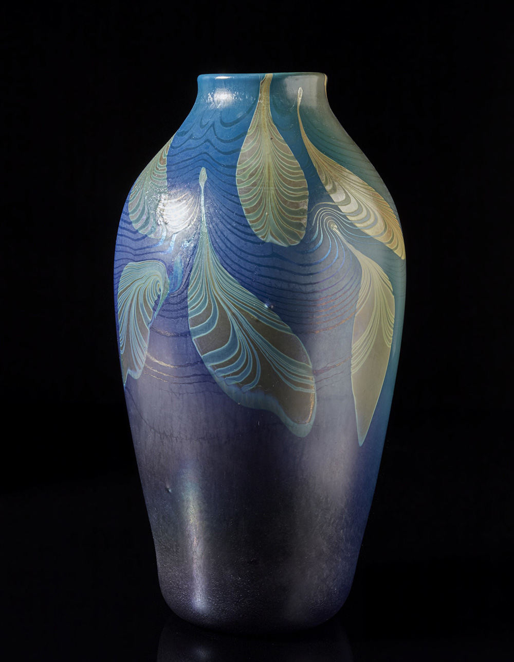 Grande vaso in stile Tiffany in vetro iridescente blu, verde e giallo decorato a foglie, reca firma e numero a punta D961 (h. cm 52)