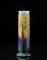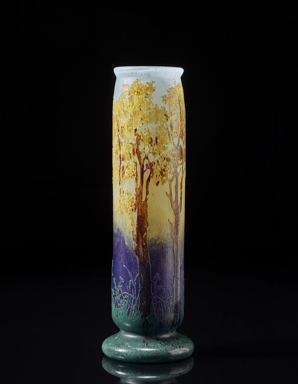 Vaso di forma cilindrica in vetro a cammeo inciso all'acido con decori vegetali nei toni del verde, blu, giallo e celeste. Inizi del sec. XX (h. cm 38). Firma incisa alla base.