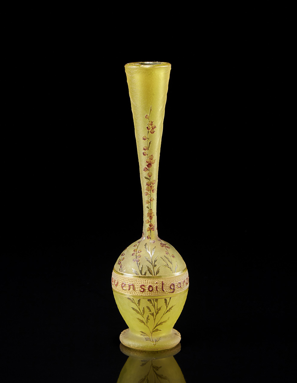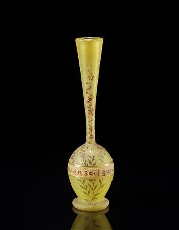 Piccolo vaso soliflore in vetro trasparente giallo corroso all'acido e smaltato con decori raffiguranti motivi vegetali, un sole, un gallo e un’aquila bicipite (h. cm 20). Recante inscrizione "Dieu en soit garde". Datato e locato alla base Compiègne-Reims 1901. Firmato in oro "Daum Nancy" sotto la base