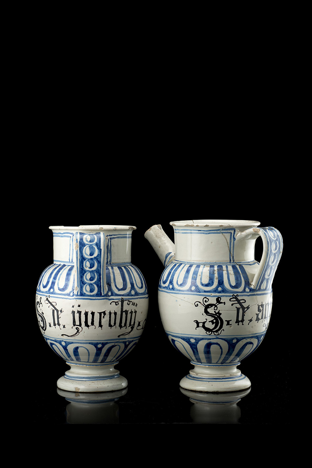 Coppia di versatoi farmaceutici in maiolica di forma globulare su piede espanso, anse a nastro e beccuccio a tubetto decorati in monocromia turchina a 'bacellature' su smalto bianco. Al centro corre il cartiglio con la scritta del contenuto farmaceutico in lettere gotiche brune. Veneto, sec. XVIII (h. cm 21) (rotture e mancanze)