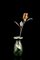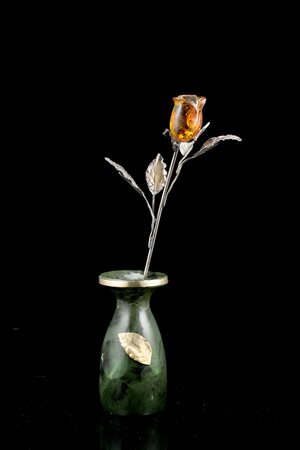 Vaso in nefrite con applicazioni in argento dorato e oro 14K, con rosa in argento e resina. Marchi di imitazione di San Pietroburgo e di K. Fabergé (h. cm 11, con fiore 27 ca.) (lievi difetti)