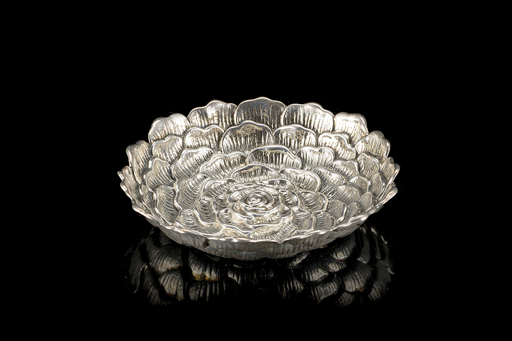 Ciotola in argento 925/1000 raffigurante un fiore, firmata Gianmaria Buccelati. Italia, sec. XX (d. cm 8) (gr 34 ca.)